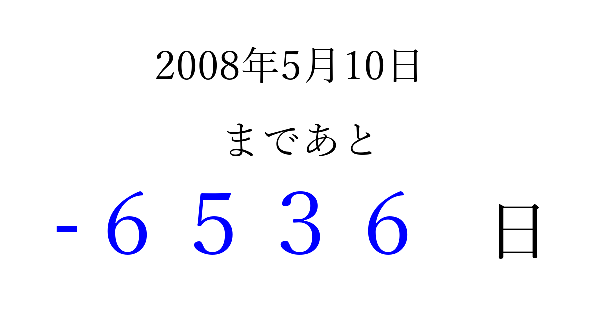 2008年5月10日(土)は もう 0000 日過ぎました 追加すると、トップページからすぐ選べるようになります ※2026/04/02現在の結果です。 最新の状態に更新する ↓シェアして、タイムライン上にカウントダウンを表示しよう!↓ 📤 この結果を共有する Tweet シェア Threads Bluesky 別の日付でカウントダウン 2008年5月のカレンダー このページをブックマークに追加すると、いつでもカウントダウンを確認できます。 (PC: Ctrl+D / Mac: ⌘+D) hitome-notes.comでは以下のページも運営しています。 指定日と期間から日付を計算 | ガチャ確率計算・シミュレーション | プライバシー・ポリシー 運営者:Avocado