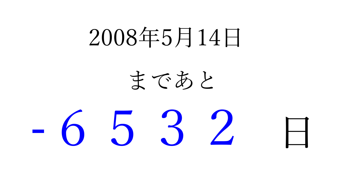 2008年5月14日(水)は もう 0000 日過ぎました 追加すると、トップページからすぐ選べるようになります ※2026/04/02現在の結果です。 最新の状態に更新する ↓シェアして、タイムライン上にカウントダウンを表示しよう!↓ 📤 この結果を共有する Tweet シェア Threads Bluesky 別の日付でカウントダウン 2008年5月のカレンダー このページをブックマークに追加すると、いつでもカウントダウンを確認できます。 (PC: Ctrl+D / Mac: ⌘+D) hitome-notes.comでは以下のページも運営しています。 指定日と期間から日付を計算 | ガチャ確率計算・シミュレーション | プライバシー・ポリシー 運営者:Avocado