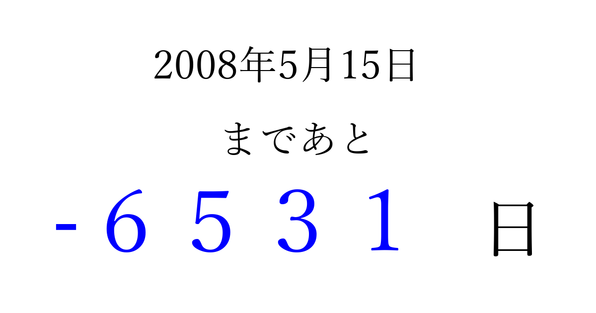 2008年5月15日(木)は もう 0000 日過ぎました 追加すると、トップページからすぐ選べるようになります ※2026/04/02現在の結果です。 最新の状態に更新する ↓シェアして、タイムライン上にカウントダウンを表示しよう!↓ 📤 この結果を共有する Tweet シェア Threads Bluesky 別の日付でカウントダウン 2008年5月のカレンダー このページをブックマークに追加すると、いつでもカウントダウンを確認できます。 (PC: Ctrl+D / Mac: ⌘+D) hitome-notes.comでは以下のページも運営しています。 指定日と期間から日付を計算 | ガチャ確率計算・シミュレーション | プライバシー・ポリシー 運営者:Avocado