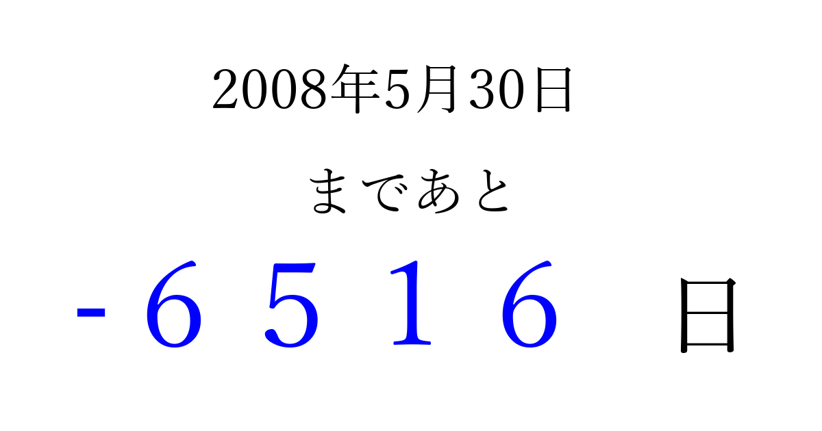 2008年5月30日(金)は もう 0000 日過ぎました 追加すると、トップページからすぐ選べるようになります ※2026/04/02現在の結果です。 最新の状態に更新する ↓シェアして、タイムライン上にカウントダウンを表示しよう!↓ 📤 この結果を共有する Tweet シェア Threads Bluesky 別の日付でカウントダウン 2008年5月のカレンダー このページをブックマークに追加すると、いつでもカウントダウンを確認できます。 (PC: Ctrl+D / Mac: ⌘+D) hitome-notes.comでは以下のページも運営しています。 指定日と期間から日付を計算 | ガチャ確率計算・シミュレーション | プライバシー・ポリシー 運営者:Avocado