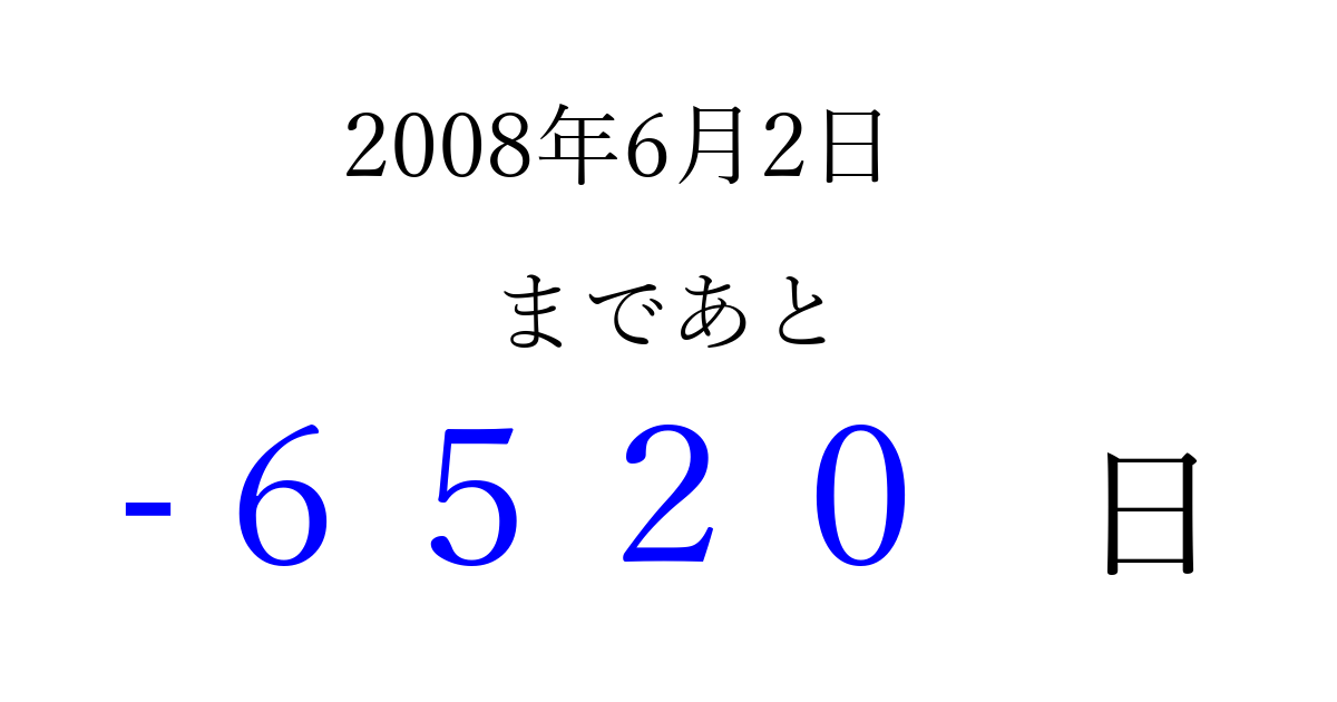 2008年6月2日(月)は もう 0000 日過ぎました 追加すると、トップページからすぐ選べるようになります ※2026/04/09現在の結果です。 最新の状態に更新する ↓シェアして、タイムライン上にカウントダウンを表示しよう!↓ 📤 この結果を共有する Tweet シェア Threads Bluesky 別の日付でカウントダウン 2008年6月のカレンダー このページをブックマークに追加すると、いつでもカウントダウンを確認できます。 (PC: Ctrl+D / Mac: ⌘+D) hitome-notes.comでは以下のページも運営しています。 指定日と期間から日付を計算 | ガチャ確率計算・シミュレーション | プライバシー・ポリシー 運営者:Avocado