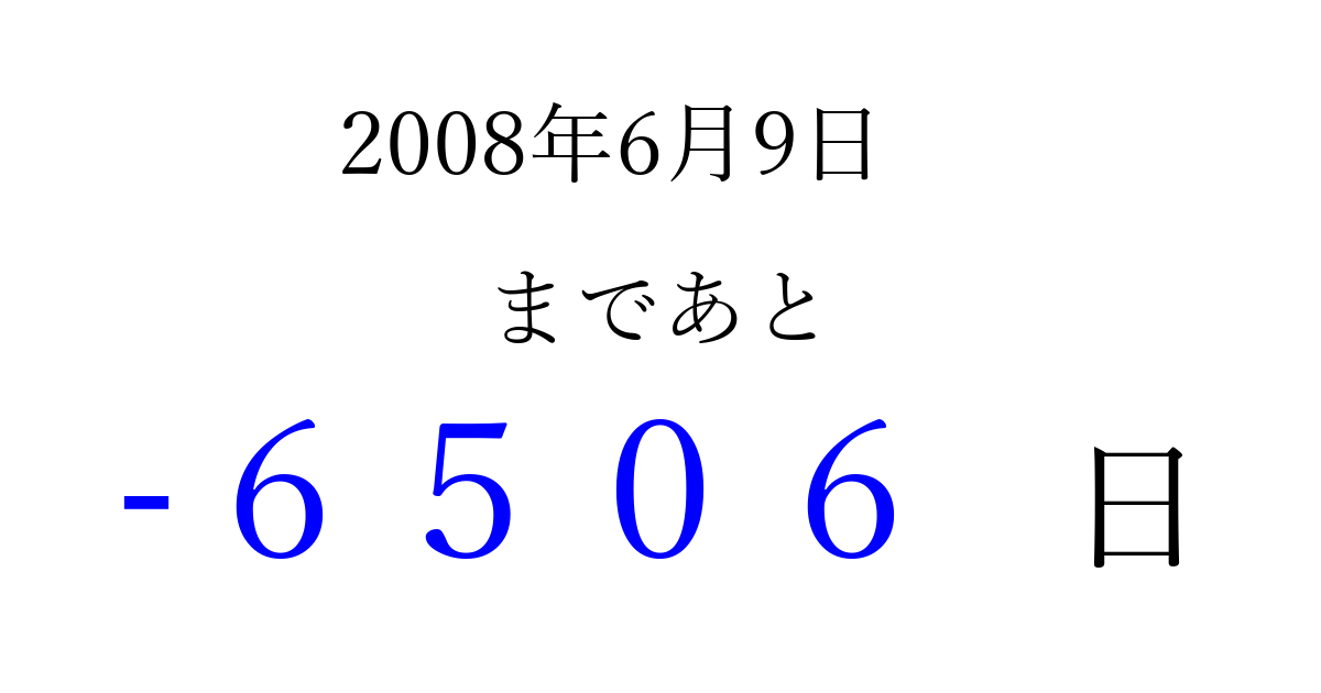 2008年6月9日(月)は もう 0000 日過ぎました 追加すると、トップページからすぐ選べるようになります ※2026/04/02現在の結果です。 最新の状態に更新する ↓シェアして、タイムライン上にカウントダウンを表示しよう!↓ 📤 この結果を共有する Tweet シェア Threads Bluesky 別の日付でカウントダウン 2008年6月のカレンダー このページをブックマークに追加すると、いつでもカウントダウンを確認できます。 (PC: Ctrl+D / Mac: ⌘+D) hitome-notes.comでは以下のページも運営しています。 指定日と期間から日付を計算 | ガチャ確率計算・シミュレーション | プライバシー・ポリシー 運営者:Avocado