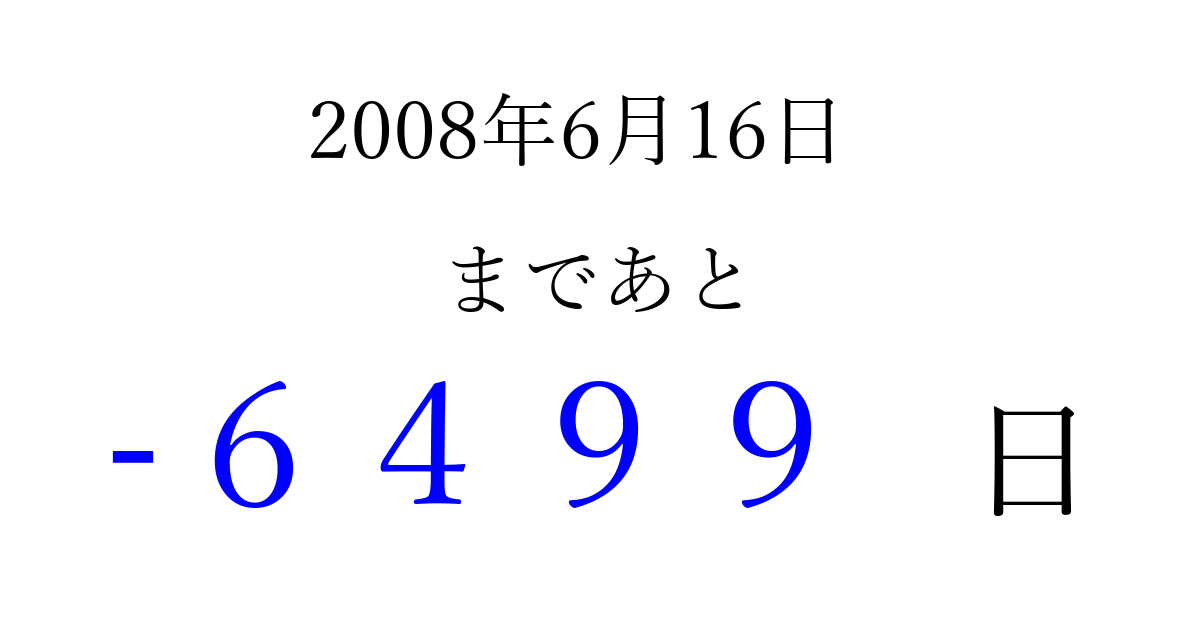 2008年6月16日(月)は もう 0000 日過ぎました 追加すると、トップページからすぐ選べるようになります ※2026/04/02現在の結果です。 最新の状態に更新する ↓シェアして、タイムライン上にカウントダウンを表示しよう!↓ 📤 この結果を共有する Tweet シェア Threads Bluesky 別の日付でカウントダウン 2008年6月のカレンダー このページをブックマークに追加すると、いつでもカウントダウンを確認できます。 (PC: Ctrl+D / Mac: ⌘+D) hitome-notes.comでは以下のページも運営しています。 指定日と期間から日付を計算 | ガチャ確率計算・シミュレーション | プライバシー・ポリシー 運営者:Avocado