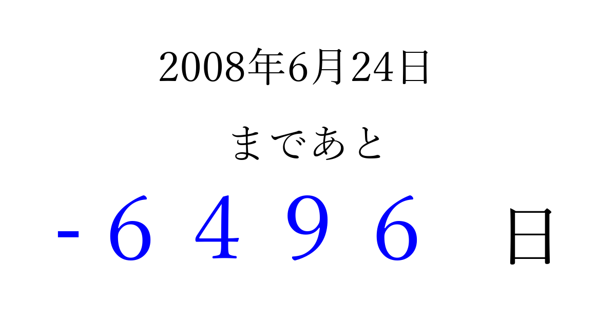 2008年6月24日(火)は もう 0000 日過ぎました 追加すると、トップページからすぐ選べるようになります ※2026/04/07現在の結果です。 最新の状態に更新する ↓シェアして、タイムライン上にカウントダウンを表示しよう!↓ 📤 この結果を共有する Tweet シェア Threads Bluesky 別の日付でカウントダウン 2008年6月のカレンダー このページをブックマークに追加すると、いつでもカウントダウンを確認できます。 (PC: Ctrl+D / Mac: ⌘+D) hitome-notes.comでは以下のページも運営しています。 指定日と期間から日付を計算 | ガチャ確率計算・シミュレーション | プライバシー・ポリシー 運営者:Avocado
