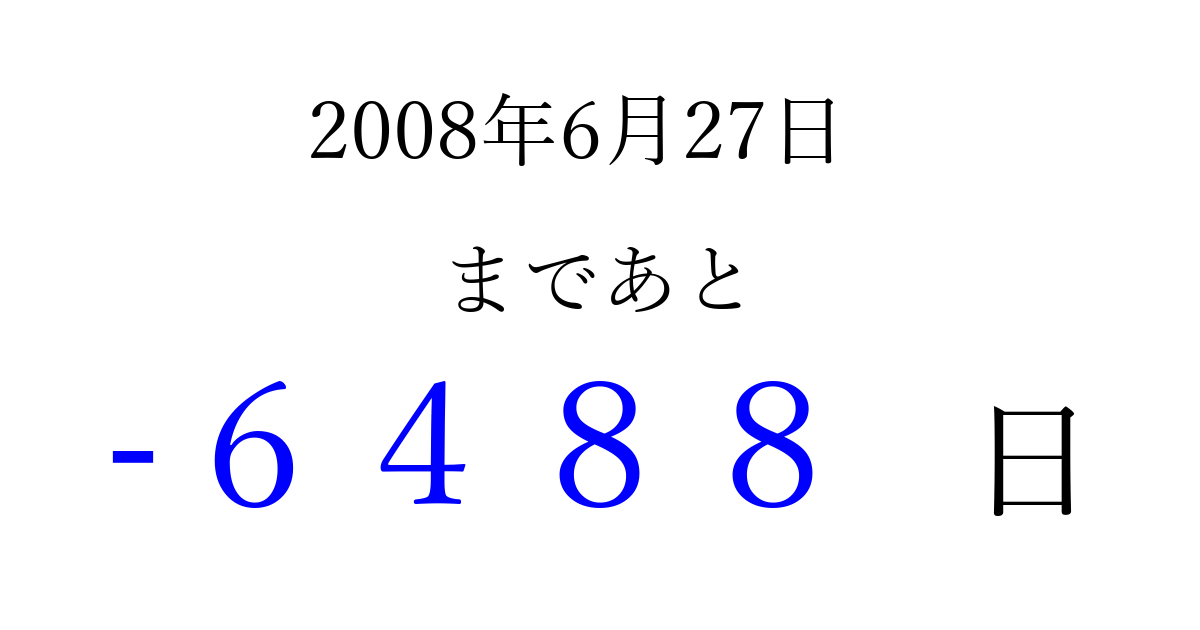 2008年6月27日(金)は もう 0000 日過ぎました 追加すると、トップページからすぐ選べるようになります ※2026/04/02現在の結果です。 最新の状態に更新する ↓シェアして、タイムライン上にカウントダウンを表示しよう!↓ 📤 この結果を共有する Tweet シェア Threads Bluesky 別の日付でカウントダウン 2008年6月のカレンダー このページをブックマークに追加すると、いつでもカウントダウンを確認できます。 (PC: Ctrl+D / Mac: ⌘+D) hitome-notes.comでは以下のページも運営しています。 指定日と期間から日付を計算 | ガチャ確率計算・シミュレーション | プライバシー・ポリシー 運営者:Avocado