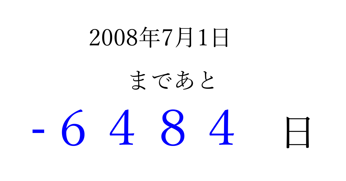 2008年7月1日(火)は もう 0000 日過ぎました 追加すると、トップページからすぐ選べるようになります ※2026/04/02現在の結果です。 最新の状態に更新する ↓シェアして、タイムライン上にカウントダウンを表示しよう!↓ 📤 この結果を共有する Tweet シェア Threads Bluesky 別の日付でカウントダウン 2008年7月のカレンダー このページをブックマークに追加すると、いつでもカウントダウンを確認できます。 (PC: Ctrl+D / Mac: ⌘+D) hitome-notes.comでは以下のページも運営しています。 指定日と期間から日付を計算 | ガチャ確率計算・シミュレーション | プライバシー・ポリシー 運営者:Avocado