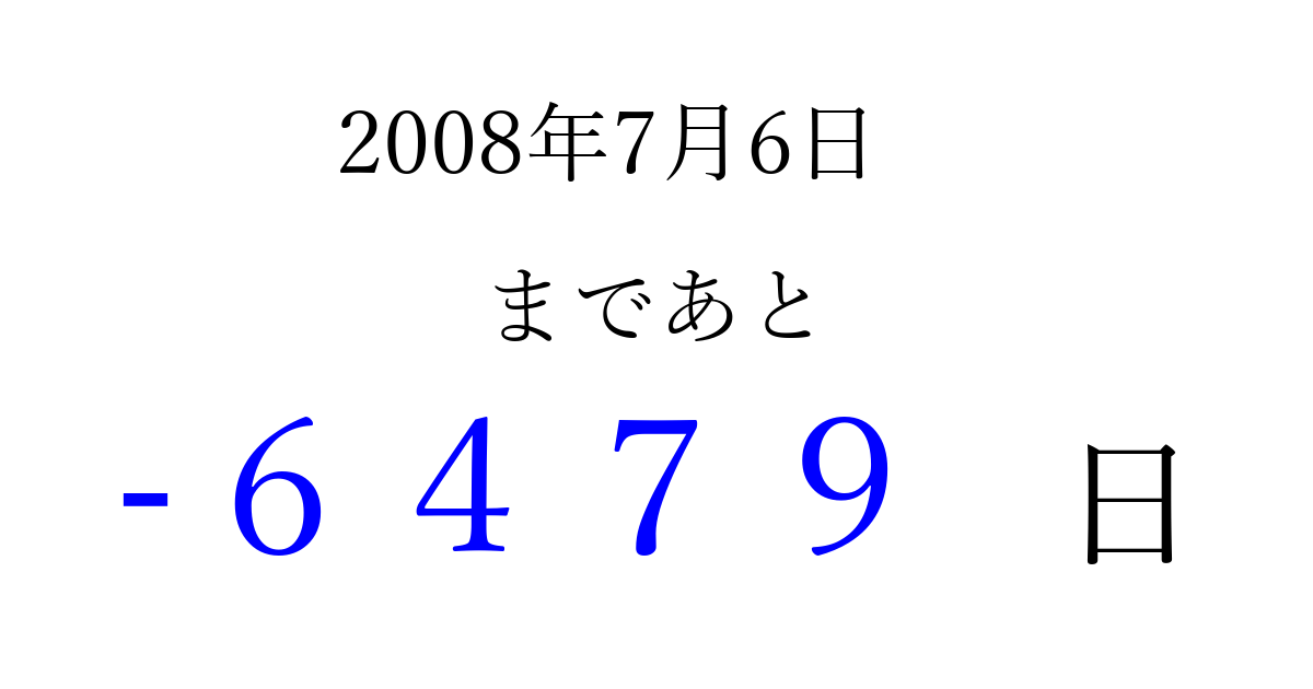 2008年7月6日(日)は もう 0000 日過ぎました 追加すると、トップページからすぐ選べるようになります ※2026/04/02現在の結果です。 最新の状態に更新する ↓シェアして、タイムライン上にカウントダウンを表示しよう!↓ 📤 この結果を共有する Tweet シェア Threads Bluesky 別の日付でカウントダウン 2008年7月のカレンダー このページをブックマークに追加すると、いつでもカウントダウンを確認できます。 (PC: Ctrl+D / Mac: ⌘+D) hitome-notes.comでは以下のページも運営しています。 指定日と期間から日付を計算 | ガチャ確率計算・シミュレーション | プライバシー・ポリシー 運営者:Avocado