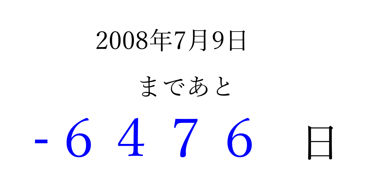 2008年7月9日(水)は もう 0000 日過ぎました 追加すると、トップページからすぐ選べるようになります ※2026/04/02現在の結果です。 最新の状態に更新する ↓シェアして、タイムライン上にカウントダウンを表示しよう!↓ 📤 この結果を共有する Tweet シェア Threads Bluesky 別の日付でカウントダウン 2008年7月のカレンダー このページをブックマークに追加すると、いつでもカウントダウンを確認できます。 (PC: Ctrl+D / Mac: ⌘+D) hitome-notes.comでは以下のページも運営しています。 指定日と期間から日付を計算 | ガチャ確率計算・シミュレーション | プライバシー・ポリシー 運営者:Avocado
