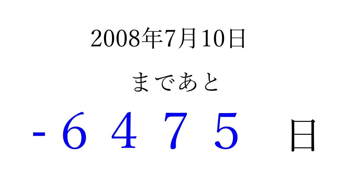 2008年7月10日(木)は もう 0000 日過ぎました 追加すると、トップページからすぐ選べるようになります ※2026/04/02現在の結果です。 最新の状態に更新する ↓シェアして、タイムライン上にカウントダウンを表示しよう!↓ 📤 この結果を共有する Tweet シェア Threads Bluesky 別の日付でカウントダウン 2008年7月のカレンダー このページをブックマークに追加すると、いつでもカウントダウンを確認できます。 (PC: Ctrl+D / Mac: ⌘+D) hitome-notes.comでは以下のページも運営しています。 指定日と期間から日付を計算 | ガチャ確率計算・シミュレーション | プライバシー・ポリシー 運営者:Avocado