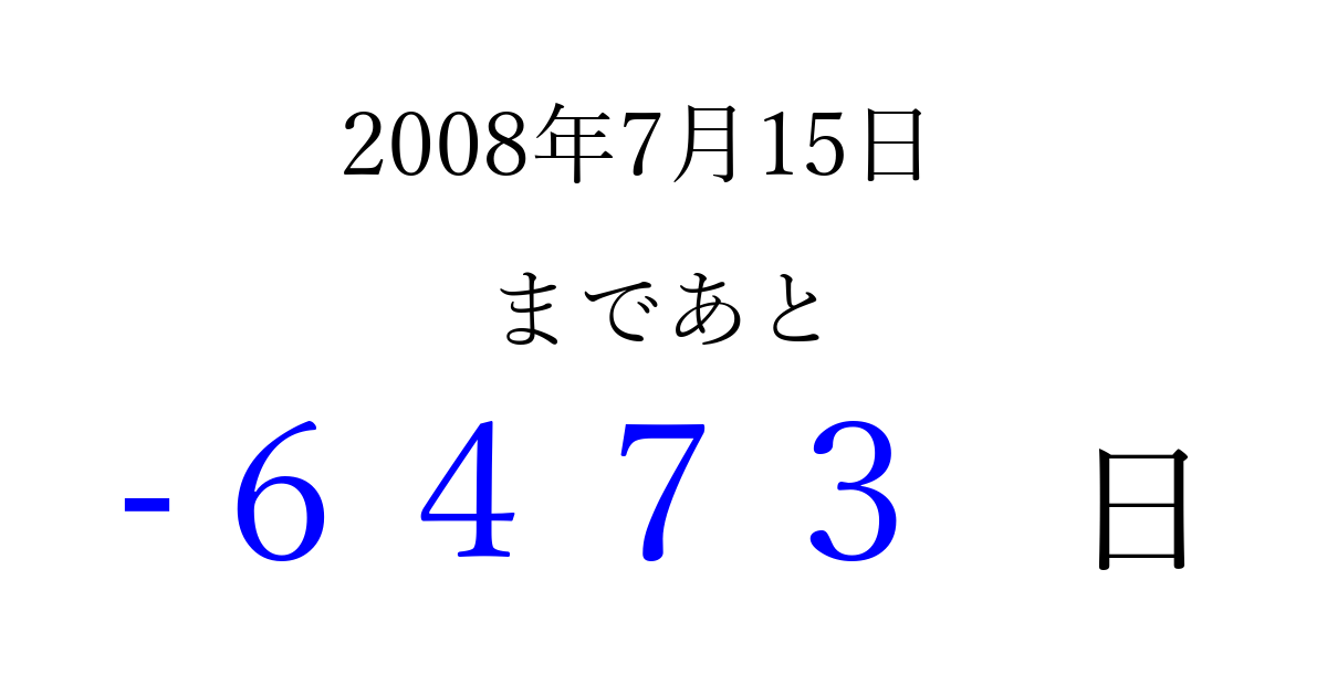 2008年7月15日(火)は もう 0000 日過ぎました 追加すると、トップページからすぐ選べるようになります ※2026/04/05現在の結果です。 最新の状態に更新する ↓シェアして、タイムライン上にカウントダウンを表示しよう!↓ 📤 この結果を共有する Tweet シェア Threads Bluesky 別の日付でカウントダウン 2008年7月のカレンダー このページをブックマークに追加すると、いつでもカウントダウンを確認できます。 (PC: Ctrl+D / Mac: ⌘+D) hitome-notes.comでは以下のページも運営しています。 指定日と期間から日付を計算 | ガチャ確率計算・シミュレーション | プライバシー・ポリシー 運営者:Avocado