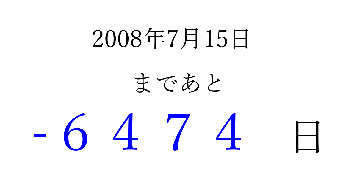 2008年7月15日(火)は もう 0000 日過ぎました 追加すると、トップページからすぐ選べるようになります ※2026/04/06現在の結果です。 最新の状態に更新する ↓シェアして、タイムライン上にカウントダウンを表示しよう!↓ 📤 この結果を共有する Tweet シェア Threads Bluesky 別の日付でカウントダウン 2008年7月のカレンダー このページをブックマークに追加すると、いつでもカウントダウンを確認できます。 (PC: Ctrl+D / Mac: ⌘+D) hitome-notes.comでは以下のページも運営しています。 指定日と期間から日付を計算 | ガチャ確率計算・シミュレーション | プライバシー・ポリシー 運営者:Avocado