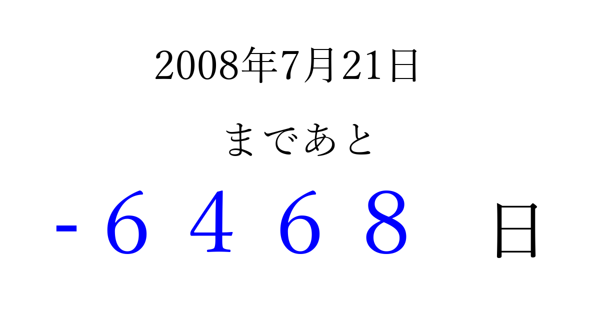 2008年7月21日(月)は もう 0000 日過ぎました 追加すると、トップページからすぐ選べるようになります ※2026/04/06現在の結果です。 最新の状態に更新する ↓シェアして、タイムライン上にカウントダウンを表示しよう!↓ 📤 この結果を共有する Tweet シェア Threads Bluesky 別の日付でカウントダウン 2008年7月のカレンダー このページをブックマークに追加すると、いつでもカウントダウンを確認できます。 (PC: Ctrl+D / Mac: ⌘+D) hitome-notes.comでは以下のページも運営しています。 指定日と期間から日付を計算 | ガチャ確率計算・シミュレーション | プライバシー・ポリシー 運営者:Avocado