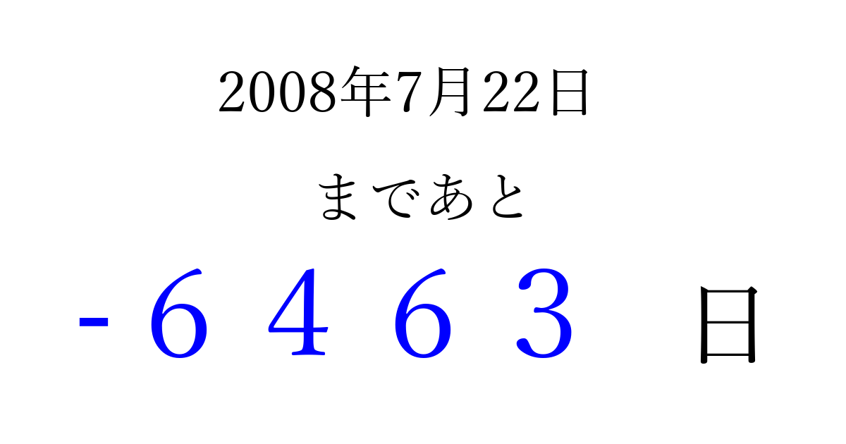 2008年7月22日(火)は もう 0000 日過ぎました 追加すると、トップページからすぐ選べるようになります ※2026/04/02現在の結果です。 最新の状態に更新する ↓シェアして、タイムライン上にカウントダウンを表示しよう!↓ 📤 この結果を共有する Tweet シェア Threads Bluesky 別の日付でカウントダウン 2008年7月のカレンダー このページをブックマークに追加すると、いつでもカウントダウンを確認できます。 (PC: Ctrl+D / Mac: ⌘+D) hitome-notes.comでは以下のページも運営しています。 指定日と期間から日付を計算 | ガチャ確率計算・シミュレーション | プライバシー・ポリシー 運営者:Avocado
