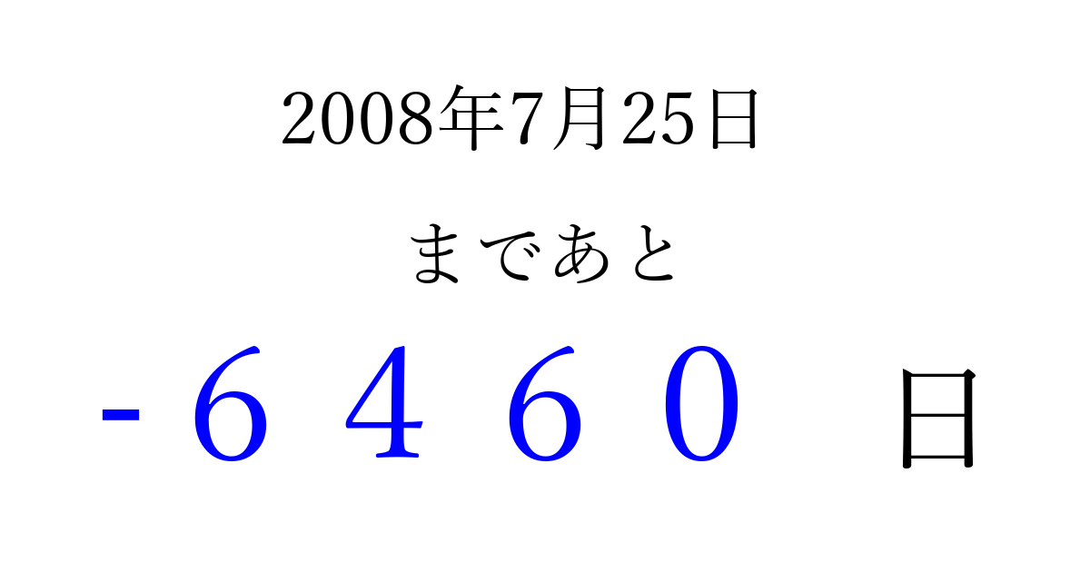 2008年7月25日(金)は もう 0000 日過ぎました 追加すると、トップページからすぐ選べるようになります ※2026/04/02現在の結果です。 最新の状態に更新する ↓シェアして、タイムライン上にカウントダウンを表示しよう!↓ 📤 この結果を共有する Tweet シェア Threads Bluesky 別の日付でカウントダウン 2008年7月のカレンダー このページをブックマークに追加すると、いつでもカウントダウンを確認できます。 (PC: Ctrl+D / Mac: ⌘+D) hitome-notes.comでは以下のページも運営しています。 指定日と期間から日付を計算 | ガチャ確率計算・シミュレーション | プライバシー・ポリシー 運営者:Avocado