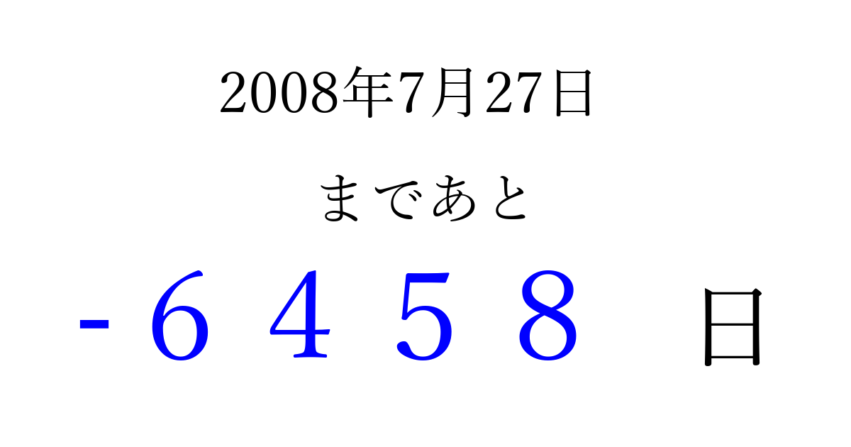 2008年7月27日(日)は もう 0000 日過ぎました 追加すると、トップページからすぐ選べるようになります ※2026/04/02現在の結果です。 最新の状態に更新する ↓シェアして、タイムライン上にカウントダウンを表示しよう!↓ 📤 この結果を共有する Tweet シェア Threads Bluesky 別の日付でカウントダウン 2008年7月のカレンダー このページをブックマークに追加すると、いつでもカウントダウンを確認できます。 (PC: Ctrl+D / Mac: ⌘+D) hitome-notes.comでは以下のページも運営しています。 指定日と期間から日付を計算 | ガチャ確率計算・シミュレーション | プライバシー・ポリシー 運営者:Avocado