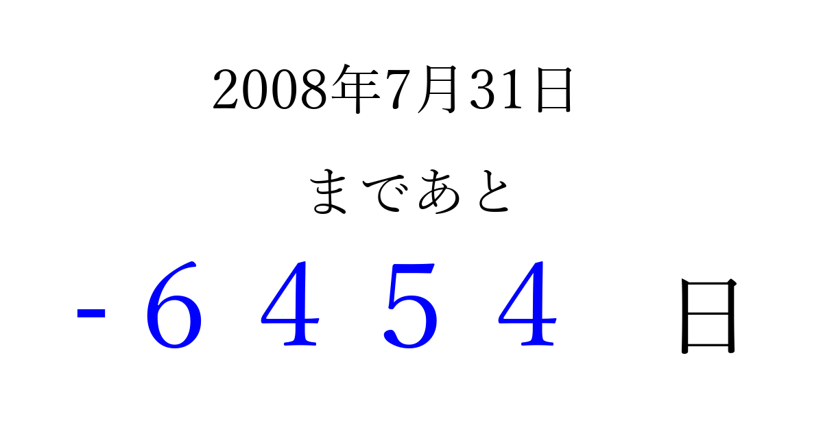 2008年7月31日(木)は もう 0000 日過ぎました 追加すると、トップページからすぐ選べるようになります ※2026/04/02現在の結果です。 最新の状態に更新する ↓シェアして、タイムライン上にカウントダウンを表示しよう!↓ 📤 この結果を共有する Tweet シェア Threads Bluesky 別の日付でカウントダウン 2008年7月のカレンダー このページをブックマークに追加すると、いつでもカウントダウンを確認できます。 (PC: Ctrl+D / Mac: ⌘+D) hitome-notes.comでは以下のページも運営しています。 指定日と期間から日付を計算 | ガチャ確率計算・シミュレーション | プライバシー・ポリシー 運営者:Avocado