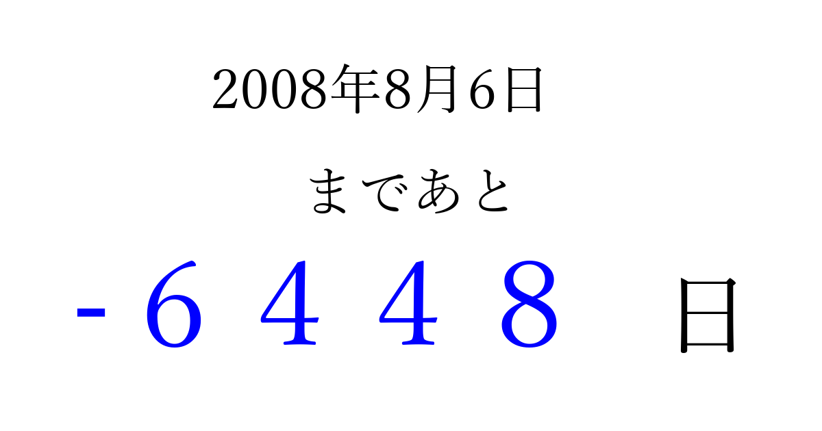 2008年8月6日(水)は もう 0000 日過ぎました 追加すると、トップページからすぐ選べるようになります ※2026/04/02現在の結果です。 最新の状態に更新する ↓シェアして、タイムライン上にカウントダウンを表示しよう!↓ 📤 この結果を共有する Tweet シェア Threads Bluesky 別の日付でカウントダウン 2008年8月のカレンダー このページをブックマークに追加すると、いつでもカウントダウンを確認できます。 (PC: Ctrl+D / Mac: ⌘+D) hitome-notes.comでは以下のページも運営しています。 指定日と期間から日付を計算 | ガチャ確率計算・シミュレーション | プライバシー・ポリシー 運営者:Avocado