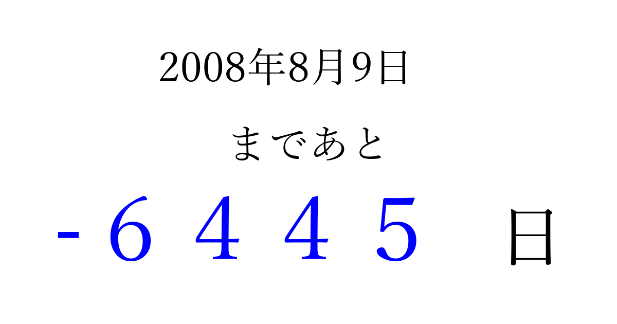 2008年8月9日(土)は もう 0000 日過ぎました 追加すると、トップページからすぐ選べるようになります ※2026/04/02現在の結果です。 最新の状態に更新する ↓シェアして、タイムライン上にカウントダウンを表示しよう!↓ 📤 この結果を共有する Tweet シェア Threads Bluesky 別の日付でカウントダウン 2008年8月のカレンダー このページをブックマークに追加すると、いつでもカウントダウンを確認できます。 (PC: Ctrl+D / Mac: ⌘+D) hitome-notes.comでは以下のページも運営しています。 指定日と期間から日付を計算 | ガチャ確率計算・シミュレーション | プライバシー・ポリシー 運営者:Avocado