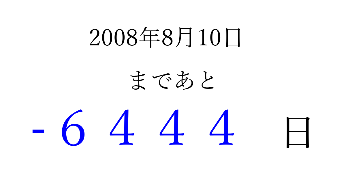 2008年8月10日(日)は もう 0000 日過ぎました 追加すると、トップページからすぐ選べるようになります ※2026/04/02現在の結果です。 最新の状態に更新する ↓シェアして、タイムライン上にカウントダウンを表示しよう!↓ 📤 この結果を共有する Tweet シェア Threads Bluesky 別の日付でカウントダウン 2008年8月のカレンダー このページをブックマークに追加すると、いつでもカウントダウンを確認できます。 (PC: Ctrl+D / Mac: ⌘+D) hitome-notes.comでは以下のページも運営しています。 指定日と期間から日付を計算 | ガチャ確率計算・シミュレーション | プライバシー・ポリシー 運営者:Avocado