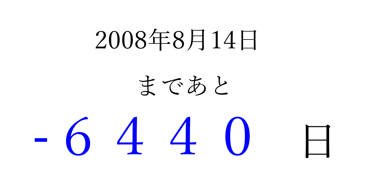 2008年8月14日(木)は もう 0000 日過ぎました 追加すると、トップページからすぐ選べるようになります ※2026/04/02現在の結果です。 最新の状態に更新する ↓シェアして、タイムライン上にカウントダウンを表示しよう!↓ 📤 この結果を共有する Tweet シェア Threads Bluesky 別の日付でカウントダウン 2008年8月のカレンダー このページをブックマークに追加すると、いつでもカウントダウンを確認できます。 (PC: Ctrl+D / Mac: ⌘+D) hitome-notes.comでは以下のページも運営しています。 指定日と期間から日付を計算 | ガチャ確率計算・シミュレーション | プライバシー・ポリシー 運営者:Avocado