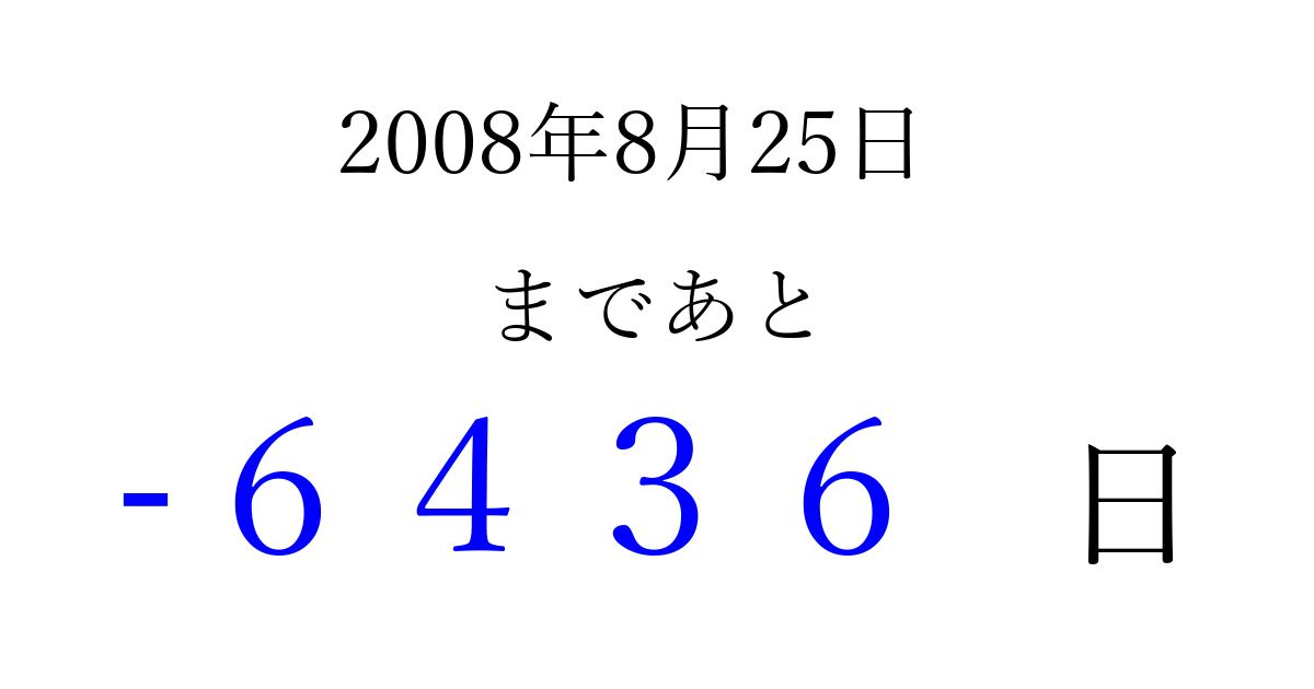 2008年8月25日(月)は もう 0000 日過ぎました 追加すると、トップページからすぐ選べるようになります ※2026/04/09現在の結果です。 最新の状態に更新する ↓シェアして、タイムライン上にカウントダウンを表示しよう!↓ 📤 この結果を共有する Tweet シェア Threads Bluesky 別の日付でカウントダウン 2008年8月のカレンダー このページをブックマークに追加すると、いつでもカウントダウンを確認できます。 (PC: Ctrl+D / Mac: ⌘+D) hitome-notes.comでは以下のページも運営しています。 指定日と期間から日付を計算 | ガチャ確率計算・シミュレーション | プライバシー・ポリシー 運営者:Avocado