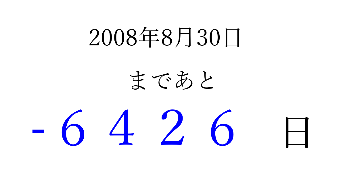 2008年8月30日(土)は もう 0000 日過ぎました 追加すると、トップページからすぐ選べるようになります ※2026/04/04現在の結果です。 最新の状態に更新する ↓シェアして、タイムライン上にカウントダウンを表示しよう!↓ 📤 この結果を共有する Tweet シェア Threads Bluesky 別の日付でカウントダウン 2008年8月のカレンダー このページをブックマークに追加すると、いつでもカウントダウンを確認できます。 (PC: Ctrl+D / Mac: ⌘+D) hitome-notes.comでは以下のページも運営しています。 指定日と期間から日付を計算 | ガチャ確率計算・シミュレーション | プライバシー・ポリシー 運営者:Avocado