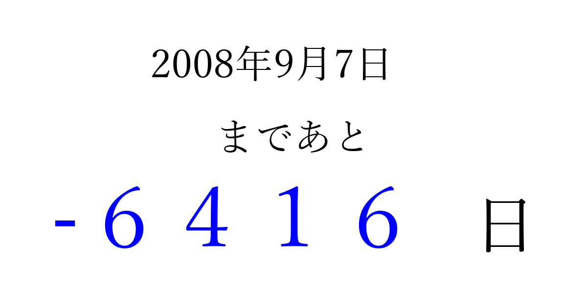 2008年9月7日(日)は もう 0000 日過ぎました 追加すると、トップページからすぐ選べるようになります ※2026/04/02現在の結果です。 最新の状態に更新する ↓シェアして、タイムライン上にカウントダウンを表示しよう!↓ 📤 この結果を共有する Tweet シェア Threads Bluesky 別の日付でカウントダウン 2008年9月のカレンダー このページをブックマークに追加すると、いつでもカウントダウンを確認できます。 (PC: Ctrl+D / Mac: ⌘+D) hitome-notes.comでは以下のページも運営しています。 指定日と期間から日付を計算 | ガチャ確率計算・シミュレーション | プライバシー・ポリシー 運営者:Avocado