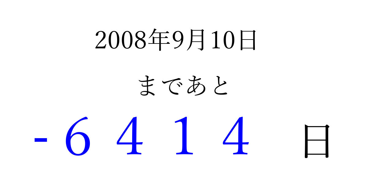 2008年9月10日(水)は もう 0000 日過ぎました 追加すると、トップページからすぐ選べるようになります ※2026/04/03現在の結果です。 最新の状態に更新する ↓シェアして、タイムライン上にカウントダウンを表示しよう!↓ 📤 この結果を共有する Tweet シェア Threads Bluesky 別の日付でカウントダウン 2008年9月のカレンダー このページをブックマークに追加すると、いつでもカウントダウンを確認できます。 (PC: Ctrl+D / Mac: ⌘+D) hitome-notes.comでは以下のページも運営しています。 指定日と期間から日付を計算 | ガチャ確率計算・シミュレーション | プライバシー・ポリシー 運営者:Avocado