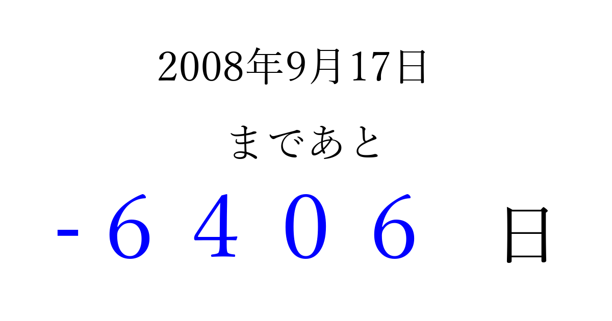 2008年9月17日(水)は もう 0000 日過ぎました 追加すると、トップページからすぐ選べるようになります ※2026/04/02現在の結果です。 最新の状態に更新する ↓シェアして、タイムライン上にカウントダウンを表示しよう!↓ 📤 この結果を共有する Tweet シェア Threads Bluesky 別の日付でカウントダウン 2008年9月のカレンダー このページをブックマークに追加すると、いつでもカウントダウンを確認できます。 (PC: Ctrl+D / Mac: ⌘+D) hitome-notes.comでは以下のページも運営しています。 指定日と期間から日付を計算 | ガチャ確率計算・シミュレーション | プライバシー・ポリシー 運営者:Avocado