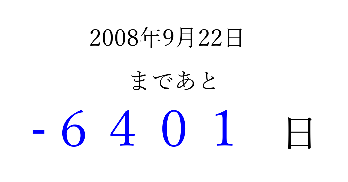 2008年9月22日(月)は もう 0000 日過ぎました 追加すると、トップページからすぐ選べるようになります ※2026/04/02現在の結果です。 最新の状態に更新する ↓シェアして、タイムライン上にカウントダウンを表示しよう!↓ 📤 この結果を共有する Tweet シェア Threads Bluesky 別の日付でカウントダウン 2008年9月のカレンダー このページをブックマークに追加すると、いつでもカウントダウンを確認できます。 (PC: Ctrl+D / Mac: ⌘+D) hitome-notes.comでは以下のページも運営しています。 指定日と期間から日付を計算 | ガチャ確率計算・シミュレーション | プライバシー・ポリシー 運営者:Avocado