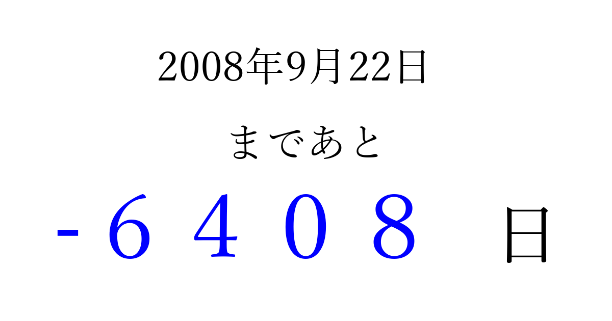 2008年9月22日(月)は もう 0000 日過ぎました 追加すると、トップページからすぐ選べるようになります ※2026/04/09現在の結果です。 最新の状態に更新する ↓シェアして、タイムライン上にカウントダウンを表示しよう!↓ 📤 この結果を共有する Tweet シェア Threads Bluesky 別の日付でカウントダウン 2008年9月のカレンダー このページをブックマークに追加すると、いつでもカウントダウンを確認できます。 (PC: Ctrl+D / Mac: ⌘+D) hitome-notes.comでは以下のページも運営しています。 指定日と期間から日付を計算 | ガチャ確率計算・シミュレーション | プライバシー・ポリシー 運営者:Avocado