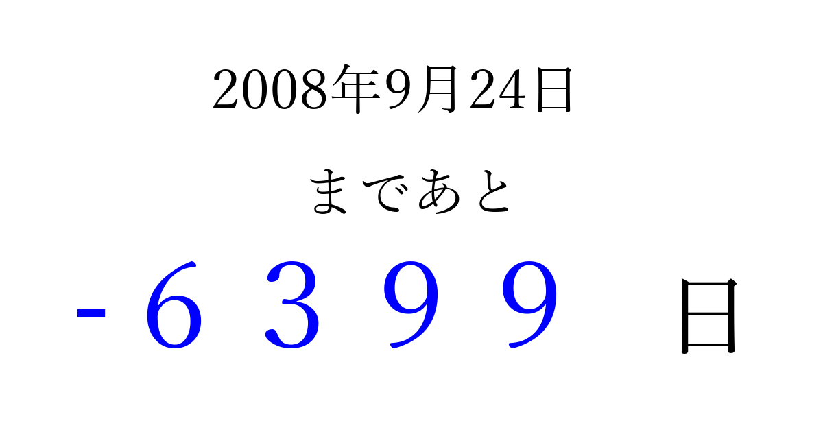 2008年9月24日(水)は もう 0000 日過ぎました 追加すると、トップページからすぐ選べるようになります ※2026/04/02現在の結果です。 最新の状態に更新する ↓シェアして、タイムライン上にカウントダウンを表示しよう!↓ 📤 この結果を共有する Tweet シェア Threads Bluesky 別の日付でカウントダウン 2008年9月のカレンダー このページをブックマークに追加すると、いつでもカウントダウンを確認できます。 (PC: Ctrl+D / Mac: ⌘+D) hitome-notes.comでは以下のページも運営しています。 指定日と期間から日付を計算 | ガチャ確率計算・シミュレーション | プライバシー・ポリシー 運営者:Avocado