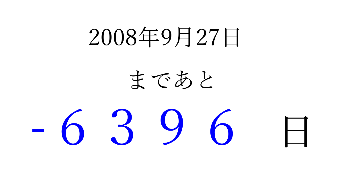 2008年9月27日(土)は もう 0000 日過ぎました 追加すると、トップページからすぐ選べるようになります ※2026/04/02現在の結果です。 最新の状態に更新する ↓シェアして、タイムライン上にカウントダウンを表示しよう!↓ 📤 この結果を共有する Tweet シェア Threads Bluesky 別の日付でカウントダウン 2008年9月のカレンダー このページをブックマークに追加すると、いつでもカウントダウンを確認できます。 (PC: Ctrl+D / Mac: ⌘+D) hitome-notes.comでは以下のページも運営しています。 指定日と期間から日付を計算 | ガチャ確率計算・シミュレーション | プライバシー・ポリシー 運営者:Avocado