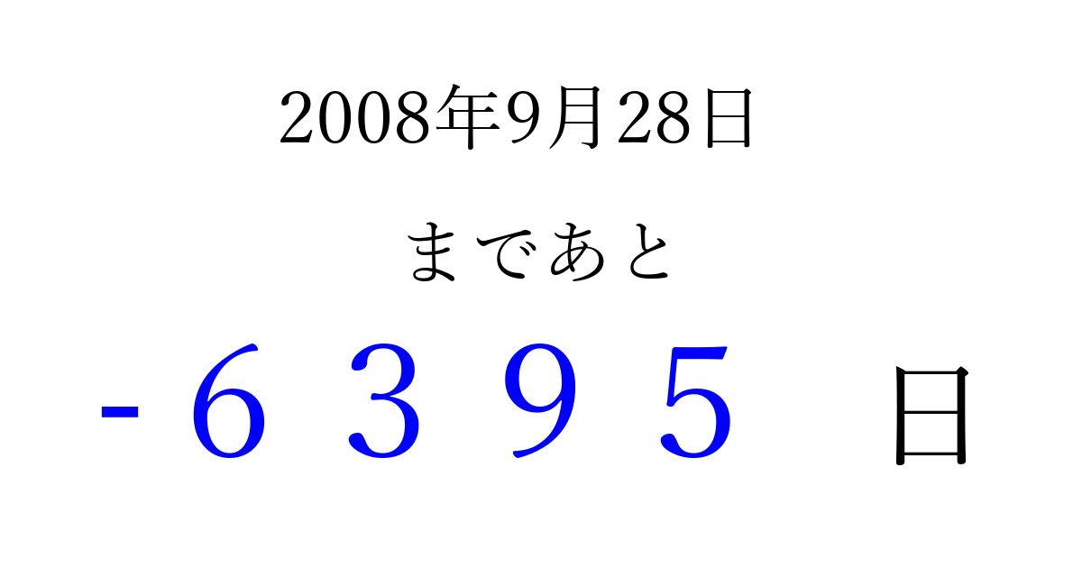 2008年9月28日(日)は もう 0000 日過ぎました 追加すると、トップページからすぐ選べるようになります ※2026/04/02現在の結果です。 最新の状態に更新する ↓シェアして、タイムライン上にカウントダウンを表示しよう!↓ 📤 この結果を共有する Tweet シェア Threads Bluesky 別の日付でカウントダウン 2008年9月のカレンダー このページをブックマークに追加すると、いつでもカウントダウンを確認できます。 (PC: Ctrl+D / Mac: ⌘+D) hitome-notes.comでは以下のページも運営しています。 指定日と期間から日付を計算 | ガチャ確率計算・シミュレーション | プライバシー・ポリシー 運営者:Avocado