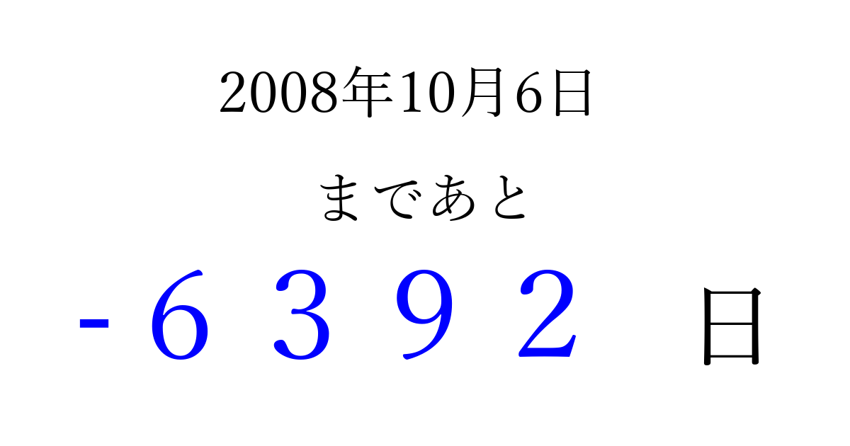2008年10月6日(月)は もう 0000 日過ぎました 追加すると、トップページからすぐ選べるようになります ※2026/04/07現在の結果です。 最新の状態に更新する ↓シェアして、タイムライン上にカウントダウンを表示しよう!↓ 📤 この結果を共有する Tweet シェア Threads Bluesky 別の日付でカウントダウン 2008年10月のカレンダー このページをブックマークに追加すると、いつでもカウントダウンを確認できます。 (PC: Ctrl+D / Mac: ⌘+D) hitome-notes.comでは以下のページも運営しています。 指定日と期間から日付を計算 | ガチャ確率計算・シミュレーション | プライバシー・ポリシー 運営者:Avocado
