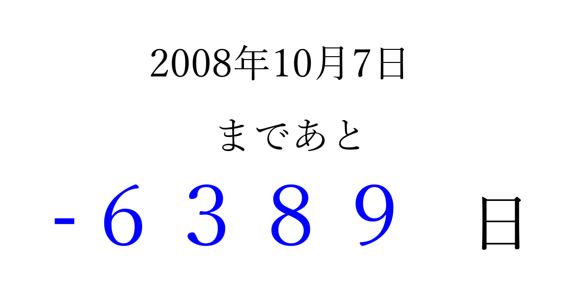 2008年10月7日(火)は もう 0000 日過ぎました 追加すると、トップページからすぐ選べるようになります ※2026/04/05現在の結果です。 最新の状態に更新する ↓シェアして、タイムライン上にカウントダウンを表示しよう!↓ 📤 この結果を共有する Tweet シェア Threads Bluesky 別の日付でカウントダウン 2008年10月のカレンダー このページをブックマークに追加すると、いつでもカウントダウンを確認できます。 (PC: Ctrl+D / Mac: ⌘+D) hitome-notes.comでは以下のページも運営しています。 指定日と期間から日付を計算 | ガチャ確率計算・シミュレーション | プライバシー・ポリシー 運営者:Avocado