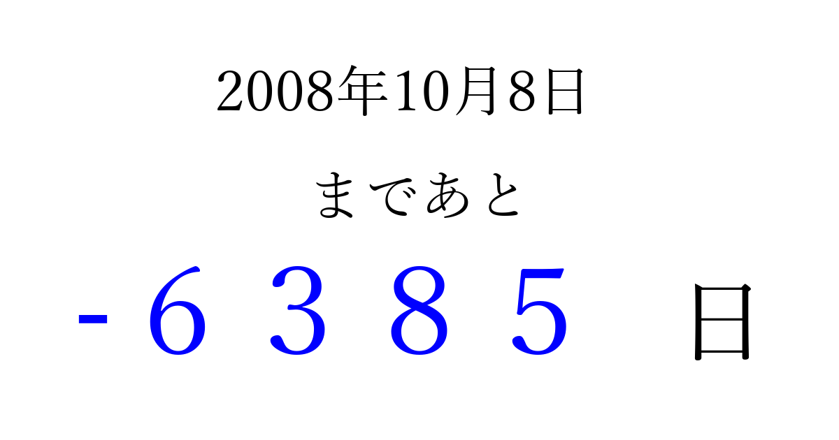 2008年10月8日(水)は もう 0000 日過ぎました 追加すると、トップページからすぐ選べるようになります ※2026/04/02現在の結果です。 最新の状態に更新する ↓シェアして、タイムライン上にカウントダウンを表示しよう!↓ 📤 この結果を共有する Tweet シェア Threads Bluesky 別の日付でカウントダウン 2008年10月のカレンダー このページをブックマークに追加すると、いつでもカウントダウンを確認できます。 (PC: Ctrl+D / Mac: ⌘+D) hitome-notes.comでは以下のページも運営しています。 指定日と期間から日付を計算 | ガチャ確率計算・シミュレーション | プライバシー・ポリシー 運営者:Avocado