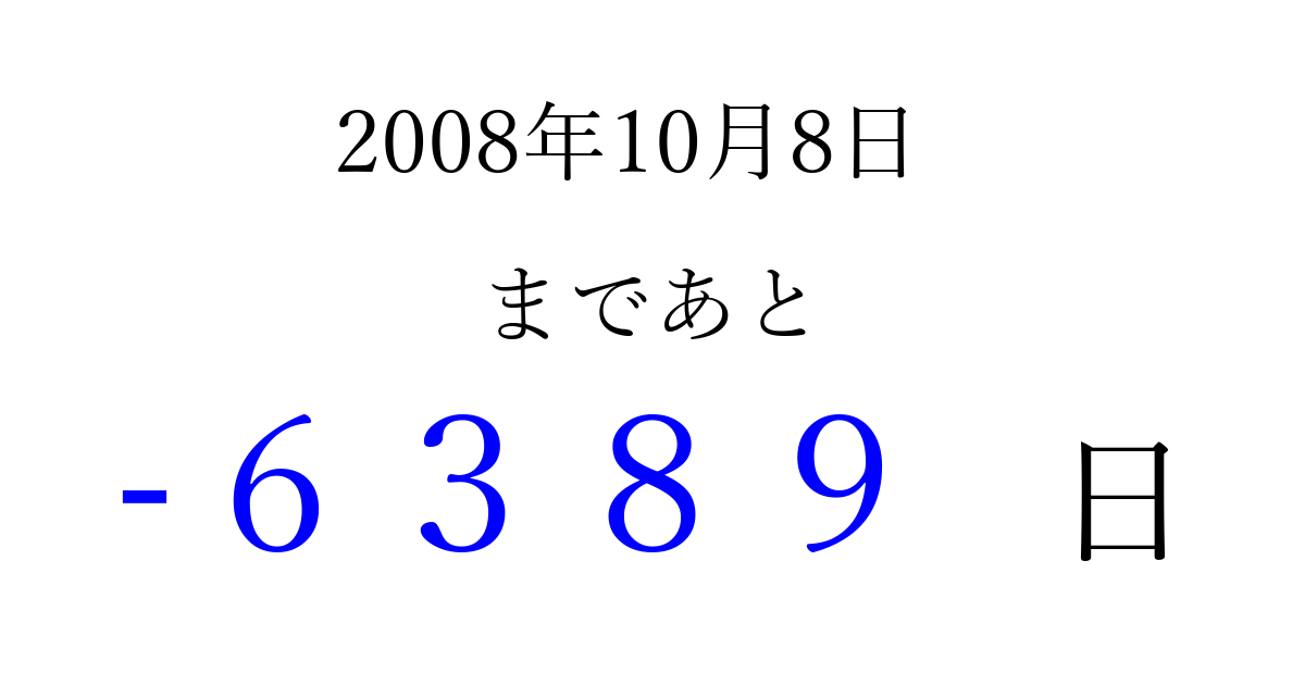 2008年10月8日(水)は もう 0000 日過ぎました 追加すると、トップページからすぐ選べるようになります ※2026/04/06現在の結果です。 最新の状態に更新する ↓シェアして、タイムライン上にカウントダウンを表示しよう!↓ 📤 この結果を共有する Tweet シェア Threads Bluesky 別の日付でカウントダウン 2008年10月のカレンダー このページをブックマークに追加すると、いつでもカウントダウンを確認できます。 (PC: Ctrl+D / Mac: ⌘+D) hitome-notes.comでは以下のページも運営しています。 指定日と期間から日付を計算 | ガチャ確率計算・シミュレーション | プライバシー・ポリシー 運営者:Avocado