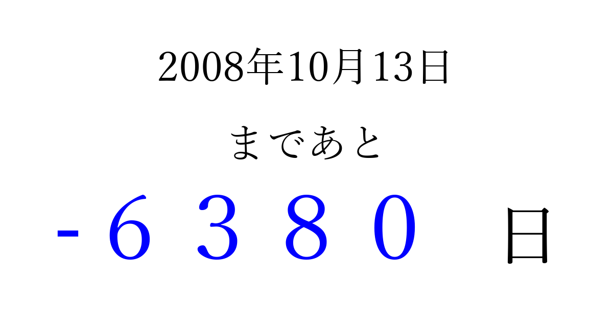 2008年10月13日(月)は もう 0000 日過ぎました 追加すると、トップページからすぐ選べるようになります ※2026/04/02現在の結果です。 最新の状態に更新する ↓シェアして、タイムライン上にカウントダウンを表示しよう!↓ 📤 この結果を共有する Tweet シェア Threads Bluesky 別の日付でカウントダウン 2008年10月のカレンダー このページをブックマークに追加すると、いつでもカウントダウンを確認できます。 (PC: Ctrl+D / Mac: ⌘+D) hitome-notes.comでは以下のページも運営しています。 指定日と期間から日付を計算 | ガチャ確率計算・シミュレーション | プライバシー・ポリシー 運営者:Avocado