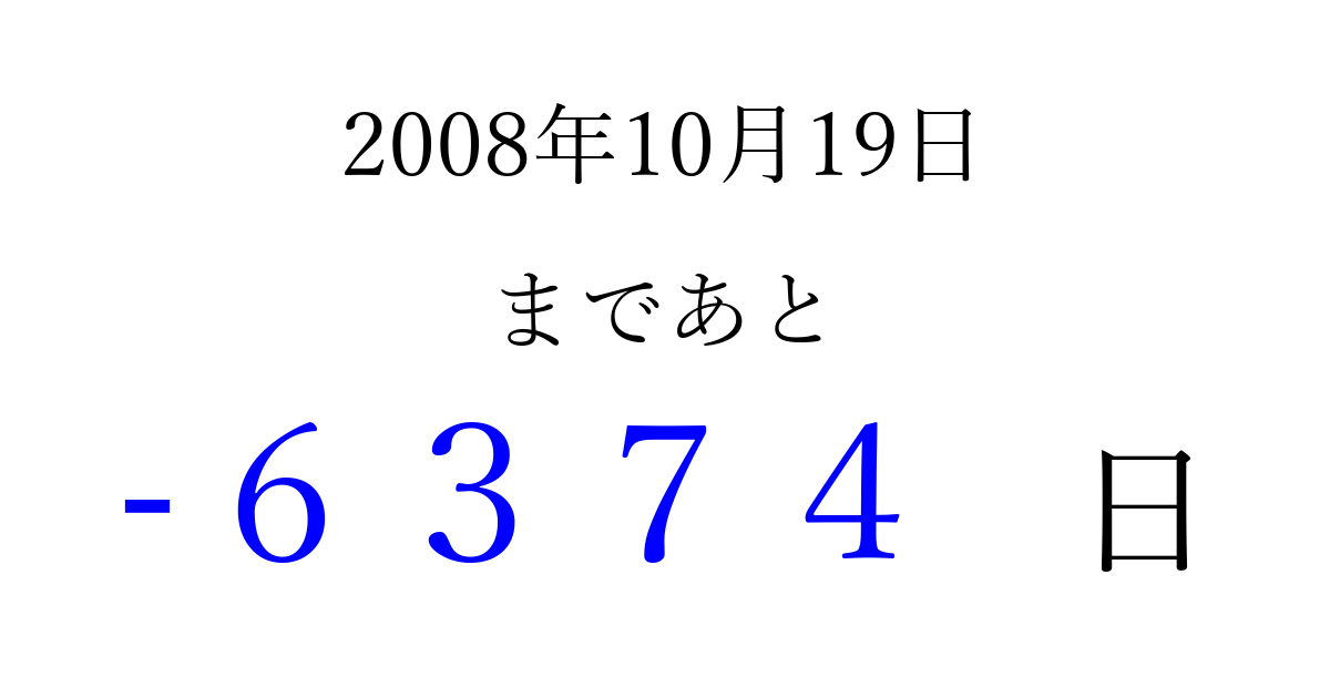 2008年10月19日(日)は もう 0000 日過ぎました 追加すると、トップページからすぐ選べるようになります ※2026/04/02現在の結果です。 最新の状態に更新する ↓シェアして、タイムライン上にカウントダウンを表示しよう!↓ 📤 この結果を共有する Tweet シェア Threads Bluesky 別の日付でカウントダウン 2008年10月のカレンダー このページをブックマークに追加すると、いつでもカウントダウンを確認できます。 (PC: Ctrl+D / Mac: ⌘+D) hitome-notes.comでは以下のページも運営しています。 指定日と期間から日付を計算 | ガチャ確率計算・シミュレーション | プライバシー・ポリシー 運営者:Avocado