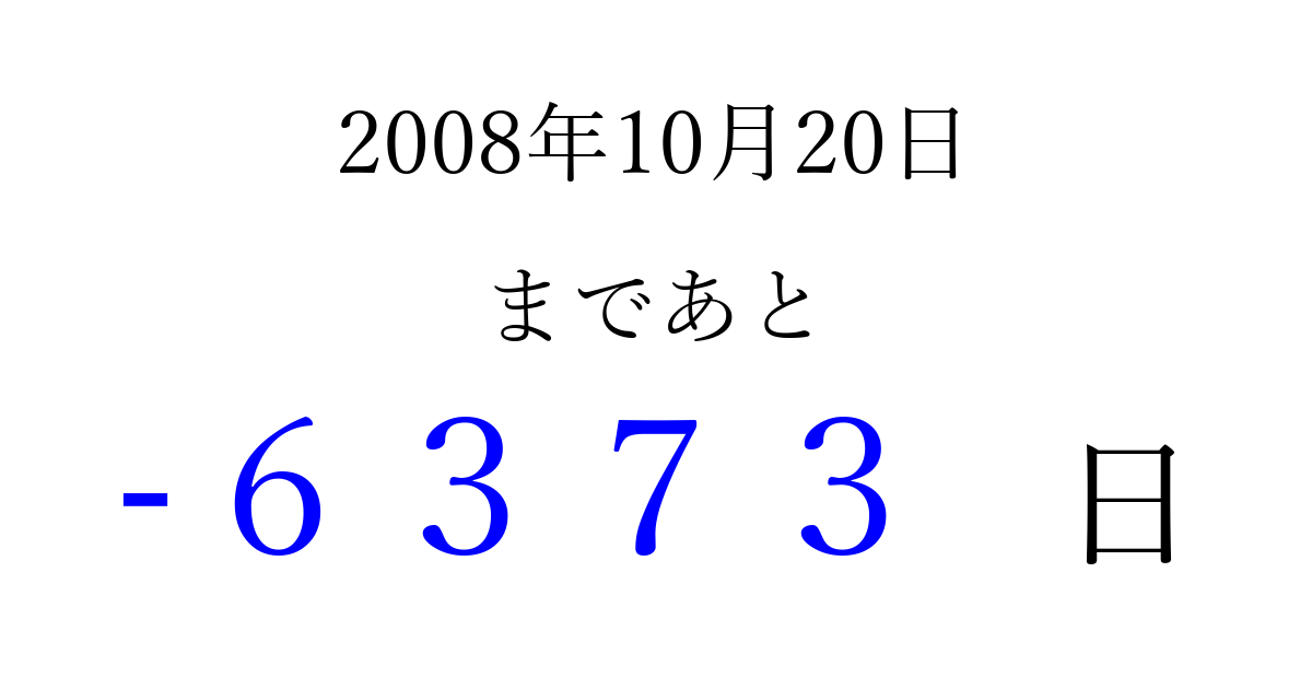 2008年10月20日(月)は もう 0000 日過ぎました 追加すると、トップページからすぐ選べるようになります ※2026/04/02現在の結果です。 最新の状態に更新する ↓シェアして、タイムライン上にカウントダウンを表示しよう!↓ 📤 この結果を共有する Tweet シェア Threads Bluesky 別の日付でカウントダウン 2008年10月のカレンダー このページをブックマークに追加すると、いつでもカウントダウンを確認できます。 (PC: Ctrl+D / Mac: ⌘+D) hitome-notes.comでは以下のページも運営しています。 指定日と期間から日付を計算 | ガチャ確率計算・シミュレーション | プライバシー・ポリシー 運営者:Avocado