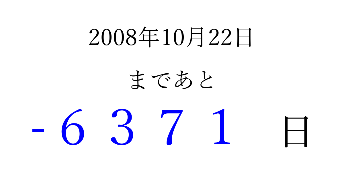 2008年10月22日(水)は もう 0000 日過ぎました 追加すると、トップページからすぐ選べるようになります ※2026/04/02現在の結果です。 最新の状態に更新する ↓シェアして、タイムライン上にカウントダウンを表示しよう!↓ 📤 この結果を共有する Tweet シェア Threads Bluesky 別の日付でカウントダウン 2008年10月のカレンダー このページをブックマークに追加すると、いつでもカウントダウンを確認できます。 (PC: Ctrl+D / Mac: ⌘+D) hitome-notes.comでは以下のページも運営しています。 指定日と期間から日付を計算 | ガチャ確率計算・シミュレーション | プライバシー・ポリシー 運営者:Avocado