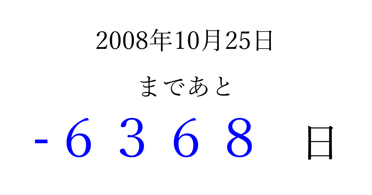2008年10月25日(土)は もう 0000 日過ぎました 追加すると、トップページからすぐ選べるようになります ※2026/04/02現在の結果です。 最新の状態に更新する ↓シェアして、タイムライン上にカウントダウンを表示しよう!↓ 📤 この結果を共有する Tweet シェア Threads Bluesky 別の日付でカウントダウン 2008年10月のカレンダー このページをブックマークに追加すると、いつでもカウントダウンを確認できます。 (PC: Ctrl+D / Mac: ⌘+D) hitome-notes.comでは以下のページも運営しています。 指定日と期間から日付を計算 | ガチャ確率計算・シミュレーション | プライバシー・ポリシー 運営者:Avocado