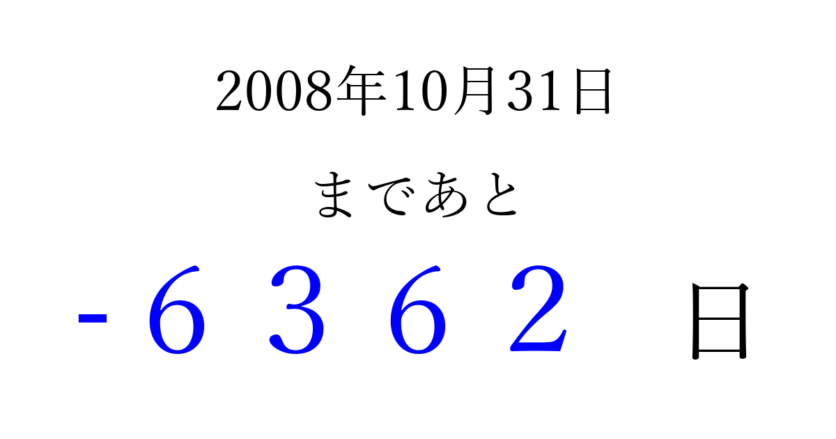 2008年10月31日(金)は もう 0000 日過ぎました 追加すると、トップページからすぐ選べるようになります ※2026/04/02現在の結果です。 最新の状態に更新する ↓シェアして、タイムライン上にカウントダウンを表示しよう!↓ 📤 この結果を共有する Tweet シェア Threads Bluesky 別の日付でカウントダウン 2008年10月のカレンダー このページをブックマークに追加すると、いつでもカウントダウンを確認できます。 (PC: Ctrl+D / Mac: ⌘+D) hitome-notes.comでは以下のページも運営しています。 指定日と期間から日付を計算 | ガチャ確率計算・シミュレーション | プライバシー・ポリシー 運営者:Avocado