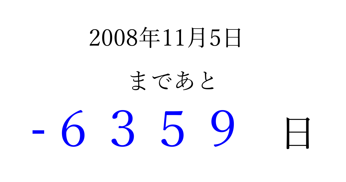2008年11月5日(水)は もう 0000 日過ぎました 追加すると、トップページからすぐ選べるようになります ※2026/04/04現在の結果です。 最新の状態に更新する ↓シェアして、タイムライン上にカウントダウンを表示しよう!↓ 📤 この結果を共有する Tweet シェア Threads Bluesky 別の日付でカウントダウン 2008年11月のカレンダー このページをブックマークに追加すると、いつでもカウントダウンを確認できます。 (PC: Ctrl+D / Mac: ⌘+D) hitome-notes.comでは以下のページも運営しています。 指定日と期間から日付を計算 | ガチャ確率計算・シミュレーション | プライバシー・ポリシー 運営者:Avocado