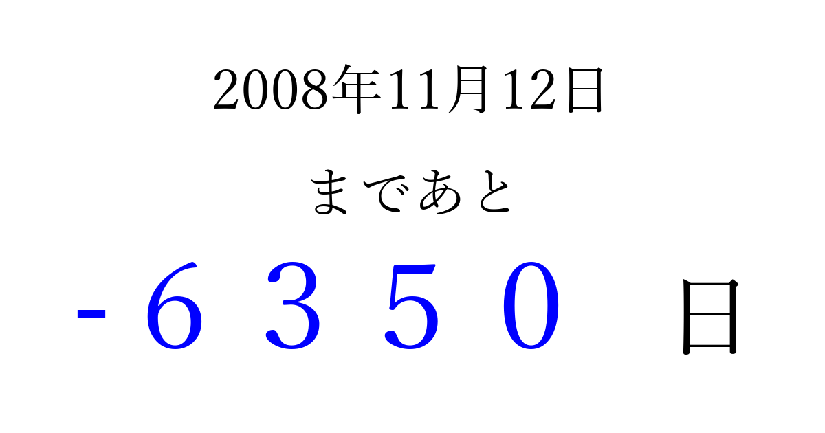 2008年11月12日(水)は もう 0000 日過ぎました 追加すると、トップページからすぐ選べるようになります ※2026/04/02現在の結果です。 最新の状態に更新する ↓シェアして、タイムライン上にカウントダウンを表示しよう!↓ 📤 この結果を共有する Tweet シェア Threads Bluesky 別の日付でカウントダウン 2008年11月のカレンダー このページをブックマークに追加すると、いつでもカウントダウンを確認できます。 (PC: Ctrl+D / Mac: ⌘+D) hitome-notes.comでは以下のページも運営しています。 指定日と期間から日付を計算 | ガチャ確率計算・シミュレーション | プライバシー・ポリシー 運営者:Avocado