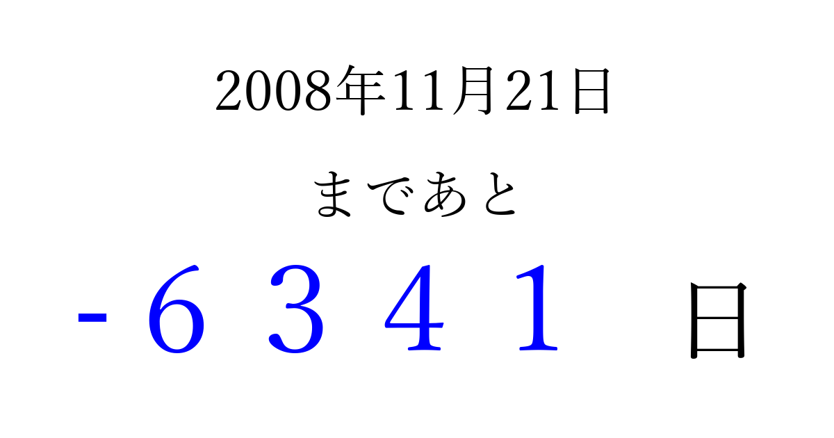 2008年11月21日(金)は もう 0000 日過ぎました 追加すると、トップページからすぐ選べるようになります ※2026/04/02現在の結果です。 最新の状態に更新する ↓シェアして、タイムライン上にカウントダウンを表示しよう!↓ 📤 この結果を共有する Tweet シェア Threads Bluesky 別の日付でカウントダウン 2008年11月のカレンダー このページをブックマークに追加すると、いつでもカウントダウンを確認できます。 (PC: Ctrl+D / Mac: ⌘+D) hitome-notes.comでは以下のページも運営しています。 指定日と期間から日付を計算 | ガチャ確率計算・シミュレーション | プライバシー・ポリシー 運営者:Avocado
