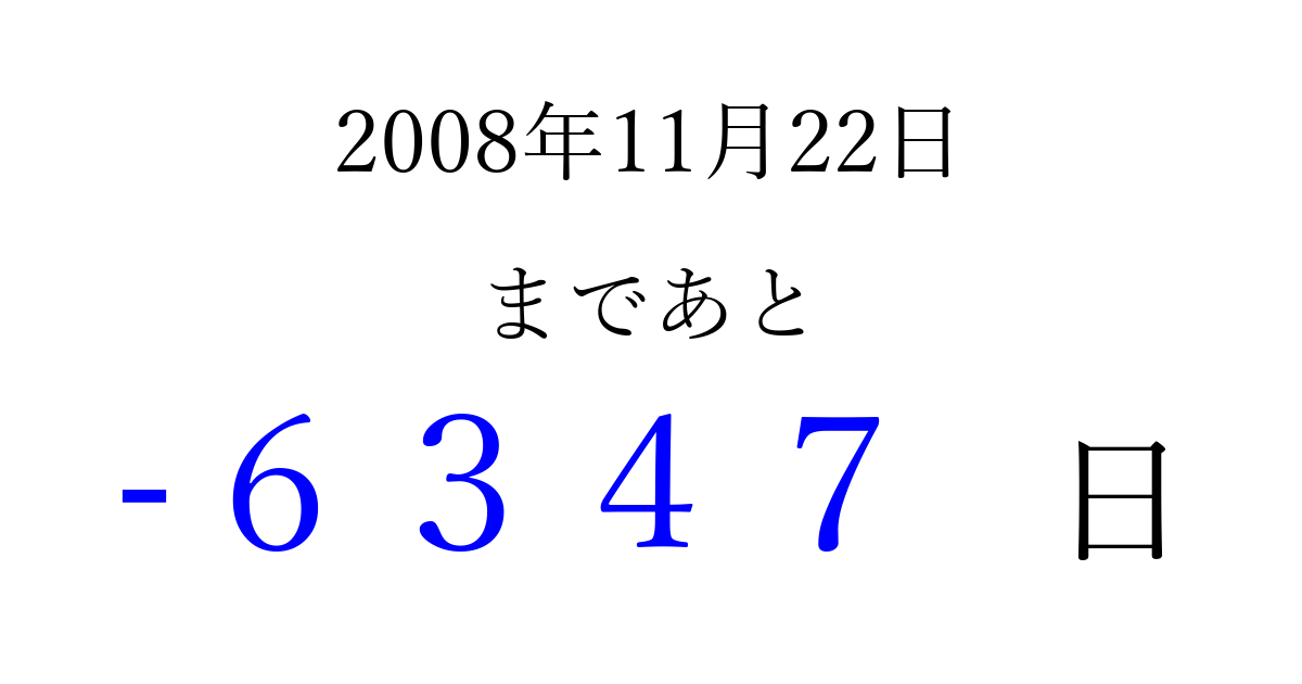 2008年11月22日(土)は もう 0000 日過ぎました 追加すると、トップページからすぐ選べるようになります ※2026/04/09現在の結果です。 最新の状態に更新する ↓シェアして、タイムライン上にカウントダウンを表示しよう!↓ 📤 この結果を共有する Tweet シェア Threads Bluesky 別の日付でカウントダウン 2008年11月のカレンダー このページをブックマークに追加すると、いつでもカウントダウンを確認できます。 (PC: Ctrl+D / Mac: ⌘+D) hitome-notes.comでは以下のページも運営しています。 指定日と期間から日付を計算 | ガチャ確率計算・シミュレーション | プライバシー・ポリシー 運営者:Avocado