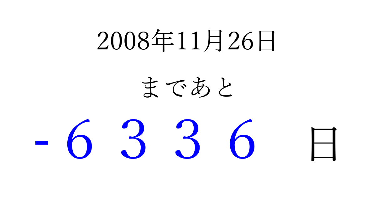 2008年11月26日(水)は もう 0000 日過ぎました 追加すると、トップページからすぐ選べるようになります ※2026/04/02現在の結果です。 最新の状態に更新する ↓シェアして、タイムライン上にカウントダウンを表示しよう!↓ 📤 この結果を共有する Tweet シェア Threads Bluesky 別の日付でカウントダウン 2008年11月のカレンダー このページをブックマークに追加すると、いつでもカウントダウンを確認できます。 (PC: Ctrl+D / Mac: ⌘+D) hitome-notes.comでは以下のページも運営しています。 指定日と期間から日付を計算 | ガチャ確率計算・シミュレーション | プライバシー・ポリシー 運営者:Avocado