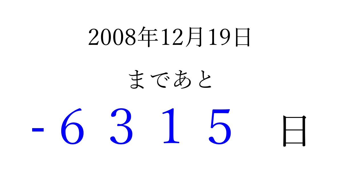 2008年12月19日(金)は もう 0000 日過ぎました 追加すると、トップページからすぐ選べるようになります ※2026/04/04現在の結果です。 最新の状態に更新する ↓シェアして、タイムライン上にカウントダウンを表示しよう!↓ 📤 この結果を共有する Tweet シェア Threads Bluesky 別の日付でカウントダウン 2008年12月のカレンダー このページをブックマークに追加すると、いつでもカウントダウンを確認できます。 (PC: Ctrl+D / Mac: ⌘+D) hitome-notes.comでは以下のページも運営しています。 指定日と期間から日付を計算 | ガチャ確率計算・シミュレーション | プライバシー・ポリシー 運営者:Avocado